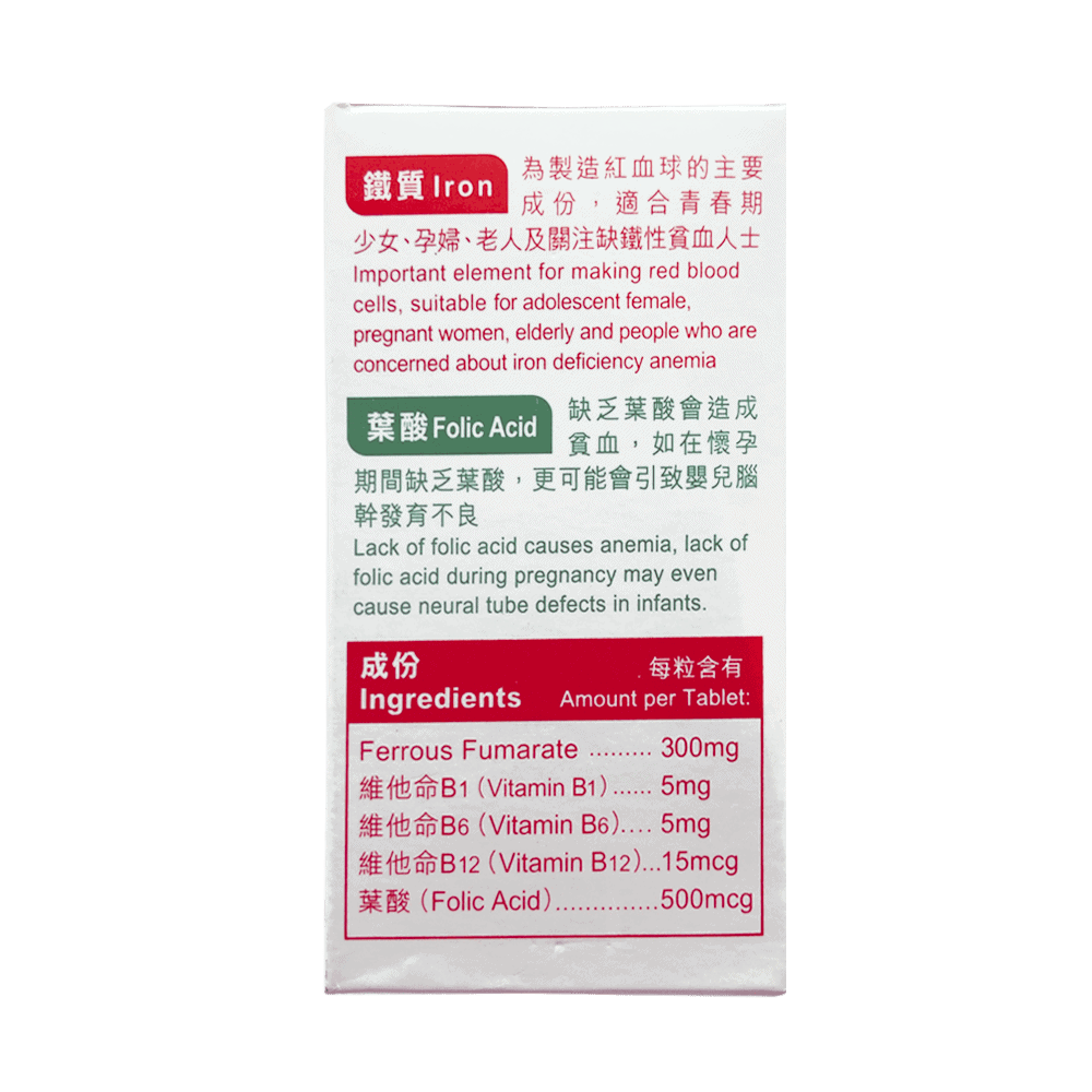 - 此產品顯示每粒含有300毫克Ferrous Fumarate(富馬酸亞鐵),由於富馬酸亞鐵化合物只有大約1/3是鐵質,所以實質上這個產品每粒含有約99毫克鐵質。